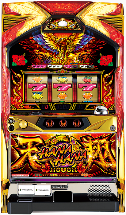 6号機ハナハナシリーズは攻撃的なデザインに進化しており、ホウオウでは初のゴールドリールを採用。攻撃的なリールカラーデザインが彩る。